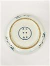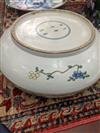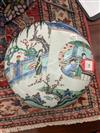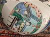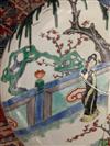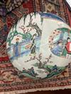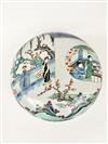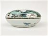 CHINESE WUCAI PORCELAIN LIFT-COVER BUN FORM BOX. Panels of figural decoration in landscape; six-character mark under foot. - D: 11".Estimate $200-300