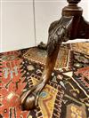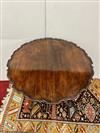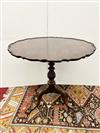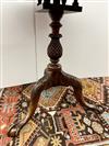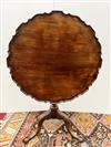 CHIPPENDALE STYLE CARVED MAHOGANY TILT-TOP TEATABLE WITH PIECRUST TOP, 19th century. Bird-cage mechanism; carved pedestal raised on three cabriole legs ending in claw-and-ball feet H: 29 in.; top, D: 30 3/4 in.Estimate $250-350