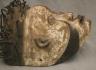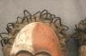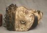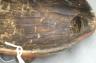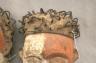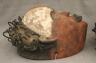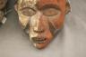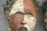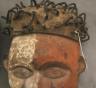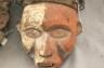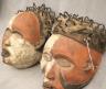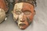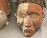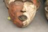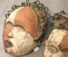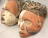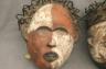 CONGOLESE BAKONGO SPIRITUAL PROTECTION MASKS This pair of Bakongo masks from the Democratic Republic of the Congo presents a striking example of ritual sculpture designed for spiritual mediation and community protection. Carved from wood and meticulously painted with a bisected or "quartered" color scheme of white kaolin and red ochre, the faces symbolize the threshold between the living and the ancestral spirit realms. The masks are notably aggressive in their construction, featuring a dense crown of hand-forged iron nails and metal staples driven into the forehead and perimeter—a technique similar to nkisi power figures where each nail represents a vow, a legal pact, or a plea for spiritual intervention. The presence of glass or mirrored eyes further enhances their power, intended to reflect malevolent energy away from the community and grant the wearer "four-eyed" vision to see hidden truths. Traditionally used by secret societies or judicial specialists, these masks served as instruments of social order, empowered by the metallic "charges" and the braided straw elements to enforce laws and heal communal discord. height: (approx.) 11.5 inches $200-300