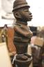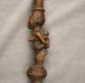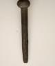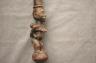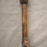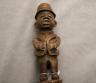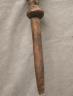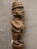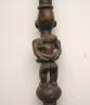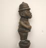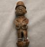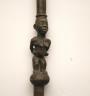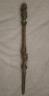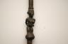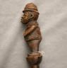 CONGOLESE COLONIST MVWALA STAFF This Kongo colonist staff is a unique example of late 19th or early 20th-century Democratic Republic of the Congo woodcarving that blends traditional political authority with the social commentary of the colonial era. Carved from a single piece of dark, dense wood, the staff is surmounted by a finely detailed finial depicting a European colonial official, easily identified by his pith helmet, Western-style suit, and often a stoic or commanding facial expression. The slender shaft is typically segmented by rounded or geometric bands—representing key points in a leader's reign—and often features a metal tip designed for planting the staff firmly into the earth, symbolically linking the owner to ancestral power. While based on traditional Kongo prestige staffs (mvwala) that bolstered a chief's claims to rule, the inclusion of the "colonist" figure suggests a complex engagement with the new power dynamics, either as a satirical depiction of foreign authority, a record of historical encounter, or a prestige item tailored for trade with Europeans. Length: 43 inches $120-160