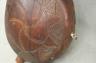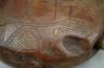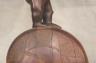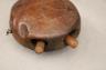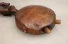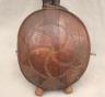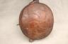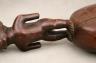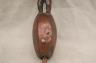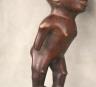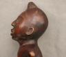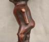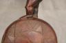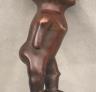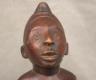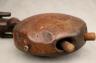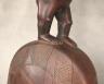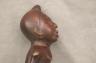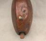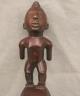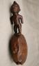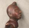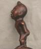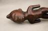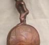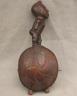 CONGOLESE KONGO RITUAL BELL Democratic Republic of the Congo This Kongo bell from the Democratic Republic of the Congo is an exquisite ritual object that merges functional acoustics with high-status sculptural art. Carved from a rich, reddish-brown wood with a lustrous patina, the bell’s body is a flattened, ovoid chamber resting on two small peg-like feet, its surface meticulously incised with a central swirling solar motif and geometric cross-hatching that likely represents the four moments of the sun and the cyclical nature of life. Surmounting the bell is a finely carved human figure in a dynamic, forward-leaning posture, exhibiting the classic Kongo aesthetic of a rounded head, expressive facial features, and a serene gaze directed slightly upward. Traditionally, such bells were used by ritual specialists, such as the nganga, to summon ancestral spirits, punctuate legal proclamations, or rhythmically accompany healing ceremonies, with the carved figure acting as a spiritual intermediary to ensure the efficacy of the ritual communication. Height: 16 inches $120-160