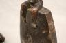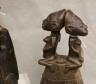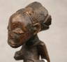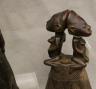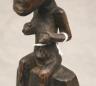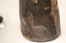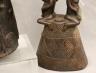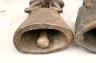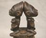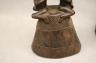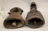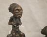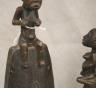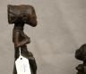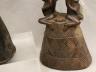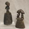 CONGOLESE LUBA CLAPPER BELLS This pair of patinated hand-carved Luba clapper bells from the Democratic Republic of the Congo are exceptional examples of prestige items where utilitarian function meets sacred sculptural form. Carved from dark, lustrous wood, each bell features a conical base adorned with intricate geometric patterns—such as the incised diamond motifs and bold spirals seen here—that are characteristic of Luba aesthetic traditions. Surmounting these bases are finely carved human figures: one bell depicts a single seated figure with a serene expression and traditional coiffure, while the other features a striking back-to-back ("janus") female composition, symbolizing the spiritual duality and all-seeing nature of ancestral guardians. Historically, such bells were used by diviners or chiefs during communal rituals and ceremonies to summon spirits, with the hollow interior and internal wooden clapper producing a rhythmic sound believed to facilitate communication between the physical and supernatural realms. height (approx): 11 inches $150-200