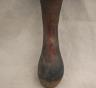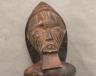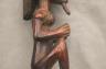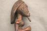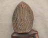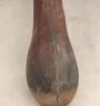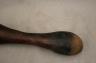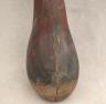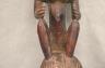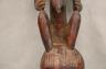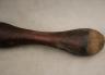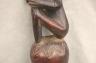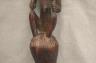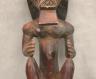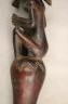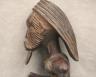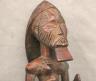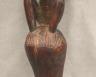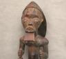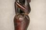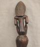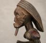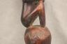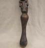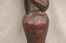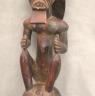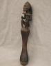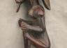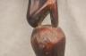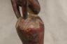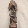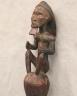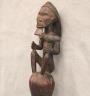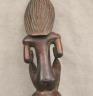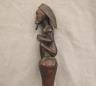CONGOLESE LUBA PRESTIGE STAFF OR SCEPTER Luba prestige staff or scepter from the Democratic Republic of the Congo. Carved from a single piece of dark, polished wood, the item features a slender, bulbous handle surmounted by a finely detailed female figure seated in a meditative posture. The figure is characterized by a serene facial expression with a prominent, flattened beard-like chin ornament—likely a symbol of elderhood or high social status—and a sophisticated coiffure that sweeps back from the forehead. Her torso is adorned with intricate geometric scarification patterns, which in Luba culture are not only aesthetic marks of beauty but also coded "maps" of history, memory, and spiritual identity. Traditionally, such scepters were held by chiefs, diviners, or titled officials as emblems of their ancestral authority and their right to rule or provide spiritual guidance to the community. Height: 20 inches $120-160