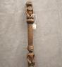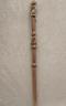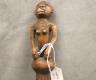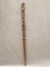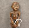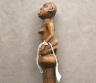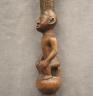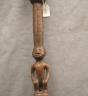 CONGOLESE YOMBE KONGO PFEMBA STAFF This Kongo pfemba staff, specifically attributed to the Yombe subgroup of the Democratic Republic of the Congo, is a prestigious artifact symbolizing authority, fertility, and ancestral lineage. Carved from dark, polished wood, the staff features a slender shaft punctuated by decorative geometric bands, surmounted by a small, finely rendered nude female figure seated on a circular base. This central figure, representing the "mother of the lineage," signifies the foundational role of women in Kongo society and the continuity of the community through maternal descent. The figure's tranquil expression, often with eyes closed in contemplation, suggests a connection to the spiritual world, while her stylized form—with a prominent torso and delicate features—highlights the artistic emphasis on beauty and social status. Such staffs were used by chiefs or high-ranking officials to signify their legitimacy and authority, serving as a powerful visual narrative linking the holder to the nurturing and governing power of the ancestor spirits. LENGTH 42.5 INCHES $120-160