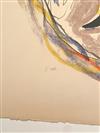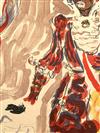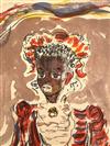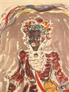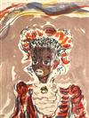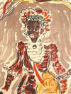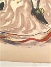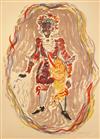 CONSTANTIN TERECHKOVITCH (Russian / French, 1902 - 1978). The Moor for the Petrushka Ballet, 1953, Lithograph with colors of a costume design. Pencil signed and dated lower right hand corner. The print is defined by its bold colors and theatrical energy; figure is a dark-skinned, standing male character with an elaborate, almost puppet-like appearance. He is dressed in an ornate, puffed, and ruff-adorned costume dominated by red, white, and blue/purple tones, suggesting a military or courtly uniform. Unframed. Not mounted or laid down.