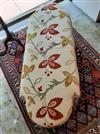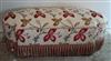CONTEMPORARY CREWELWORK-PATTERN FABRIC UPHOLSTERED, SHAPED OBLONG WINDOW SEAT. Muted red, green and ochre floral pattern on cream ground; fringed skirt - H: 18 in.; top, 52 in. x 20 in.Estimate $250-350