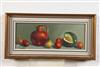 CONTEMPORARY STILL LIFE (American, 20th century). Contemporary Still Life, Signed indecipherable. Oil on Board. - 5 1/4" x 13" -- Frame: 8" x 15 3/4"Estimate $100-150