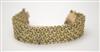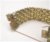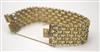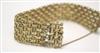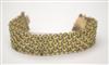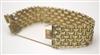 CONTINENTAL YELLOW GOLD FLEXIBLE-LINK STRAP BRACELET. Vertically-set ribbed gold bars interwoven with rows of horizontally-set oval links; concealed tongue-and-groove clasp; safety chain. L: 6 3/4 in.; W: 3/4 in. Wt. 14 dwt Estimate $500-750