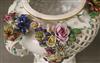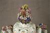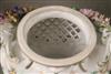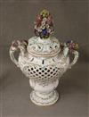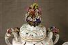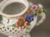 DRESDEN (CARL THIEME) POLYCHROMED PORCELAIN LIFT-COVER PORCELAIN URN AND SIMILAR BUT NON-ASSOCIATED STAND. Applied fully sculpted blossom decoration; floral sprays. Stand has reserves of mythological figures. - Compote, H: 10 3/8 in.; Urn, H: 17 in.; Stand, H: 4 in. $200-300