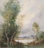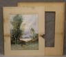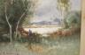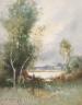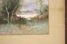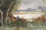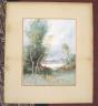 E. LANDSEER HARRIS American, 1858-1901 Lakeside Solitude gouache and watercolor on paper mounted on paperboard Impressionistic landscape where the focus is on capturing the natural light. The composition features tall, feathery trees in the foreground that frame a view of a bright lake or river, where a small figure in a blue coat sits quietly by the water's edge. Signed lower left. Unframed. Note: Artwork is mounted to a thick paperboard. artwork: 14 x 11 inches (excluding mat) $150-250