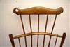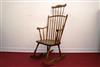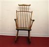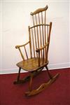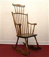EARLY 19TH CENTURY AMERICAN PINE, MAPLE AND HICKORY COMB-BACK WINDSOR ROCKING CHAIR. Pine saddle seat; seven back spindles.$250-350
