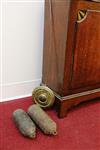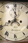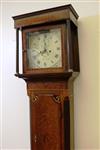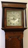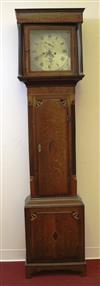 ENGLISH INLAID MAHOGANY AND OAK TALL-CASE CLOCK, 19th century. Face signed "Farr/Bromyard". Square bonnet with flat cornice and pair reeded free-standing columns, centers painted dial with Neoclassically decorated spandrels; subsidiary seconds dial with date train; case with line and quarter-patera inlay throughout. (With pendulum, weights and winding key - H: 79 1/2 in.; D: 19 1/8 in.; D: 19 in. Estimate $500-700