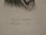Ellen Craft, the Fugitive Slave, 19th century Monochrome lithograph is a historical portrait of Ellen Craft, famously identified by the inscription below as "The Fugitive Slave." The image depicts her in the ingenious disguise she used to escape bondage in 1848: dressed as a sickly, wealthy white male planter. She is shown wearing a tall silk top hat, wire-rimmed spectacles, and a formal cravat, with her right arm held in a prominent white sling—a tactic she employed to avoid having to sign her name, as she was illiterate at the time. The portrait is rendered with fine detail, capturing a steady, resolute gaze that reflects the immense courage required for her four-day journey from Georgia to Philadelphia. Sheet: 8.75 x 7.25 inches; image: 5.5 x 4 inches $100-120