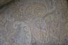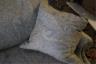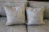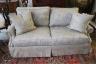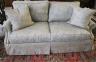 FABRIC UPHOLSTERED TWO-CUSHION SOFA. Straight back; scrolling arms; two extra square pillows; pale blue, cream and beige paisley upholstery - W: 75 in.$250-350