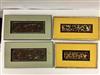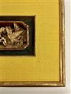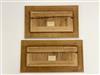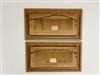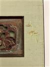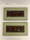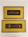 FOUR CHINESE CARVED AND PIERCED RED-PAINTED WOODEN PANELS. Two carved with birds and flowers having gilt accents; two carved with precious objects. Framed as pairs - Larger pair, 17 3/4 in. x 9 1/2 in., overall.Estimate $100-150