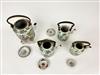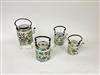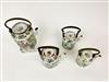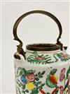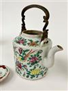 FOUR SIMILAR LATE 19TH-EARLY 20TH CENTURY CHINESE FAMILLE ROSE/FAMILLE VERTE PORCELAIN CYLINDRICAL TEAPOTS. Each with shaped brass handles. - Tallest, H: 9".Estimate $200-300