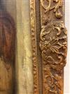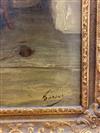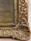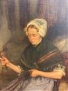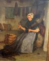 FRENCH SCHOOL (19th Century). Mending Nets, Signed lower right, appearing to read "Lanoux". Oil on canvas. A genre scene depicting a woman wearing white lace bonnet, seated in courtyard and repairing fishing nets. - 28" x 22 ½". Estimate $800-1,800