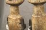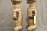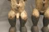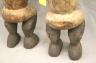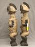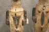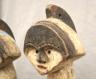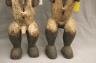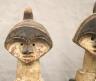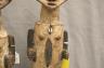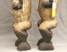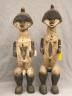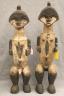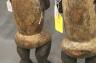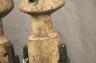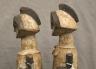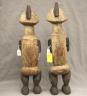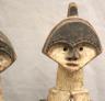 GABONESE AMBETE MBEBE RELIQUARY FIGURES This pair of Ambete (Mbebe) reliquary figures from Gabon serves as a profound example of Central African funerary art, designed to safeguard and honor the remains of ancestors. Carved from wood and coated in a thick, crusty layer of pale kaolin pigment, these statues represent a male and female pair, each featuring the characteristic elongated, cylindrical torso that historically contained a hollow dorsal cavity for storing skeletal fragments. Their faces are rendered in a distinctively stylized manner, with large, triangular planes, small circular eyes, and a dark, crested coiffure that matches the dark-stained finish of their lower limbs. The figures are further personalized with ritual adornments, such as the cowrie shell necklace on the female figure, symbolizing wealth and fertility, and the dark geometric motifs incised upon their abdomens. Within the Ambete community, these reliquaries were more than mere sculpture; they were active spiritual guardians intended to facilitate communication with the deceased and ensure the continued protection and prosperity of the lineage. Height: 24.5 inches $200-300
