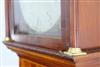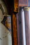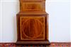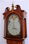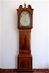 GEORGE III ENGLISH OR SCOTTISH INLAID MAHOGANY TALL-CASE CLOCK, early 19th century. Dial signed "T___ [possibly Twigg] Shelton. Bonnet has scrolling broken arch pediment with applied brass rosettes centering brass ball-and-spire finial; painted face with figural spandrels and demilune moonphase dial; shaped waist door; inlaid banding and paneling throughout. - H: 94 in.; W: 22 in.; D: 10 in. Estimate $1,500-2,500