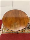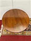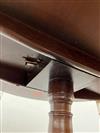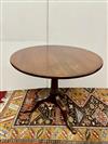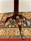GEORGE III MAHOGANY TILT-TOP TEA TABLE. Plain circular top tilts over ring-turned tapering columnar support raised on trifid base. H: 27 in.; top, D: 31 3/4 in. Condition: imperfectionsEstimate $150-250