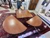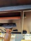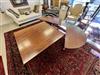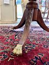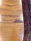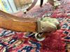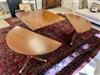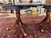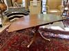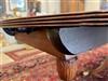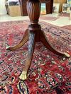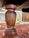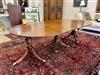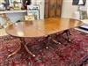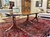 GEORGE III STYLE CARVED MAHOGANY BANQUET TABLE WITH TRIPLE-PEDESTAL BASE AND THREE LEAVES. Oval ends, reeded edge; leaf-carved urn-turned pedestals with reeded saber legs ending in brass lion paw casters - H: 29 in.; W: 50 in.; fully extended, L: 144 in. Estimate $1,500-2,500