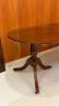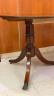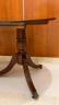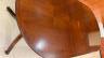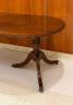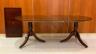 GEORGE III-STYLE INLAID MAHOGANY OVAL-TOP DINING TABLE WITH DOUBLE-PEDESTAL BASE AND TWO EXTRA LEAVES Top has cross-banded border and reeded edge; ring-turned tapering pedestals each raised on three line-inlaid saber legs ending in brass lion paw casters. H: 30". L: 60", without leaves; fully extended, 102". Width is 37 in. $500-700