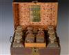 GEORGIAN METAL STRAP-SIDED WOODEN TRAVELING CELLARETTE FITTED WITH GILT-DECORATED BOTTLES AND GLASSES, late 18th - early 19th century. Including six ribbed rectangular spirits bottles with mushroom stoppers, set six smaller bottles, pair tumblers, and three goblets - Celarette, 10 3/4 in.; top, 16 3/4 in. x 11 1/4 in. Estimate $300-500