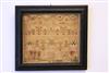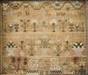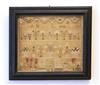GEORGIAN NEEDLEWORK SAMPLER BEARING KING GEORGE III'S ROYAL CYPHER, INITIALED "HS" AND DATED 1783. Alphabet band, various flowering blossoms, flowers and bushes, and potted plants, and decorative motifs including animals and insects, all surrounding rampant lion flanked by the letters G and R, all above maker's initial's,"HS" and date of 1783 in lower right corner - Framed, 8 in. x 9 in. Estimate $100-150