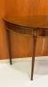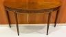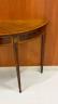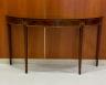 HEPPLEWHITE STYLE INLAID MAHOGANY DEMILUNE CONSOLE TABLE Top has cross-banded border with pie-wedge construction centering demi-oval reserve; inlaid, figured apron and tapering square legs. H: 33". W: 60". D: 18. $200-300