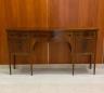 HEPPLEWHITE STYLE INLAID MAHOGANY SIDEBOARD Three aligned drawers over pair cabinet doors H: 37 3/8 in. W: 71 in. D: 19 in. $150-250