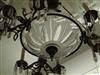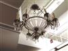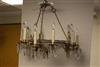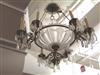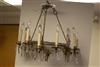 HOLLYWOOD REGENCY INSPIRED GILT BRASS AND CUT COLORLESS CRYSTAL NINE-LIGHT CHANDELIER, 1940s. Central frosted and clear colorless saucer issues three scrolling brass arms each terminating in three electrified candle nozzles suspending glass lusters - H: 24 in.; D: 24 in. Estimate $100-200