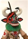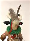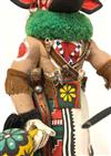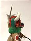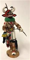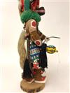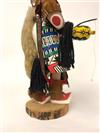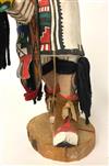 HOPI PUEBLO WAKAS (COW) KATSINA DOLL. 20th Century. Hand carved of cotton wood doll, signed "Vic M." on the bottom. Katsina doll with great detail, decorated with fur and seashells. - Height with base: 20".Estimate $250-350