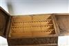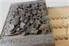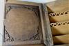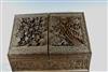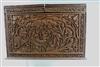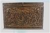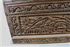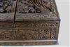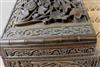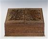 INDIAN CARVED TEAKWOOD SLANT-FRONT WRITING BOX, late 19th-early 20th century. Pair hinged doors open to paper rack; overally floral and vine carving; with key. One interior portion damaged. - H: 9 3/4 in.; W: 15 in.Estimate $50-100