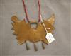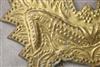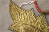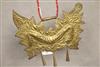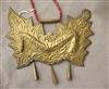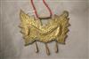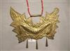 INDONESIAN PALEMBANG NAGA KALUNG NECKLACE. Brass pendant or breastplate, often referred to as a Kalung (necklace) or Ageman (attire/ornament) in a broader sense, specifically a Pendant or Liontin (pendant) in Indonesian, and it features a stylized Naga (dragon or serpent) motif. The central, dominant design is a stylized representation of a Naga, a mythical serpent or dragon figure prominent in various Asian cultures, including Indonesian mythology and art. Naga motifs are often associated with power, protection, and fertility. Palembang is the capital of Indonesia's South Sumatra province and is a port city on the Musi River. - Length: 19 inches. $80-120