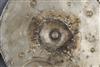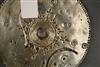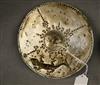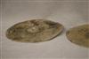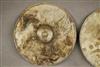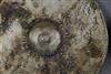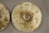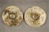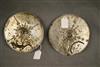 INDONESIAN TIMOR PECTORAL TROPHY DISCS. Set of two patinated Timor pectoral discs, also known as breastplates or "trophy discs". These discs are traditionally found in Timor and Southeast Maluku, Indonesia. They were historically given to warriors as rewards for successful returns from war, headhunting, or hunting expeditions, symbolizing prestige and bravery. Often referred to as mas bulan (moon-shaped discs), they are associated with celestial bodies and are considered symbols of strength and nobility within the community, particularly for Meo warriors. $80-150