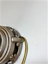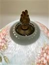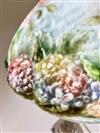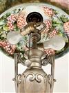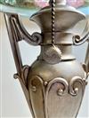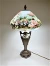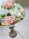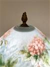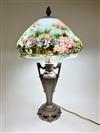 INTERIOR-FLORAL PAINTED PUFFY SHADE ART GLASS TWO-LIGHT TABLE LAMP WITH SILVERED TWO-HANDLE VASIFORM METAL BASE. Shade painted with pink, blue and white hydrangeas with green leaves on light blue textured ground. Shade, D: 14 in. H: 24 1/2 in. Estimate $200-300