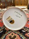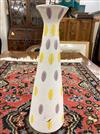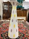 ITALIAN MID-CENTURY MODERN HAND-PAINTED PORCELAIN VASE. Elongated conical vessel with flaring lip, painted with purple and yellow oblong motifs. Raymer label affixed under base. - H: 13 3/4 in.Estimate $100-150