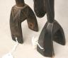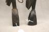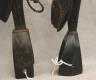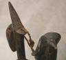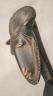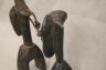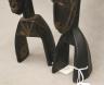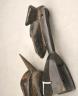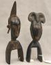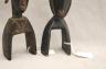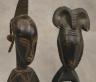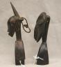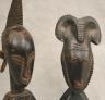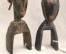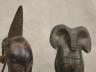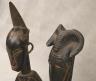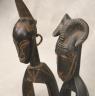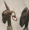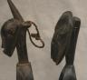 IVORY COAST GURO HEDDLE PULLEYS Patinated hand-carved pair of Guro heddle pulleys from the Ivory Coast showcase the refined aesthetic and functional artistry of West African weaving traditions. Each pulley is surmounted by a finely carved human head, with one featuring a distinctive double-braided coiffure and the other a stylized zoomorphic or geometric crown, reflecting the Guro artist's mastery of symmetrical form and delicate detail. The faces are characterized by serene, elongated features and almond-shaped eyes, while the "shoulders" of the pulleys are adorned with incised linear and chevron patterns. Historically, these objects were essential components of the narrow-band loom, used to guide the heddle threads; however, their sophisticated ornamentation served a dual purposeāto provide spiritual protection for the weaver and to demonstrate the owner's status and appreciation for beauty in everyday labor. Height: 10 inches $200-300