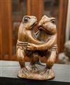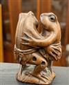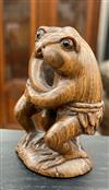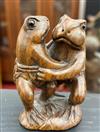 JAPANESE CARVED WOOD NETSUKE OF TWO DANCING FROGS . Characters signed under bse on inset; ivory panel H: 2 1/8 in. Property from the Estate of Erich G. Holzapfel, Washington, DCEstimate $100-200