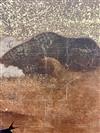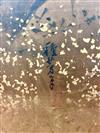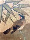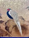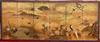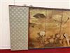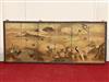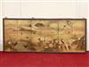 JAPANESE PAINTED PAPER MEIJI PERIOD SIX-FOLD TABLE SCREEN. 19th century. Painted with various birds amidst flowering landscapes on gold-flecked ground Tear to far right panel. - H: 48 in. W: 114 in.Estimate $2,000-4,000