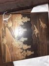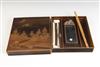 JAPANESE PEARSKIN LACQUER RECTANGULAR ARTIST'S BOX WITH SILVER BIRD FORM INK BLOT AND LACQUERED TOOLS, 19th century. Box decorated with flying mythical birds and thistles in landscape with stream - 9 3/4 in. x 8 3/4 in. Estimate $1,000-1,500