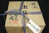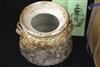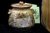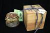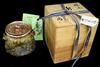 JAPANESE TEA CEREMONY MIZUSASHI GLAZED CERAMIC LIDDED CONTAINER WITH HANDLES OR FRESH WATER JAR. Presented in wooden box tied with ribbon, accompanied by paper documents. This type of presentation is known as a kiribako (paulownia wood box). The texture and style is characteristic of Shigaraki ware which the documents confirm. - height: 7 1/2 in. $100-200