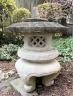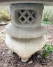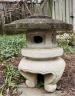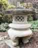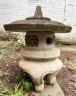JAPANESE WEATHERED STONE GARDEN LANTERN OR "ISHI-DORO" Specifically in the Yukimi-doro or "snow-viewing" style. Wide, umbrella-like roof (kasa) designed to gracefully catch falling snow; low-profile, four-legged base H: 22 in and D: 18 in $200-250