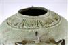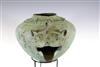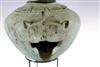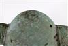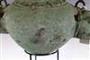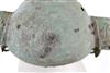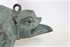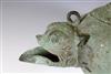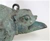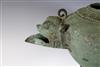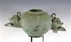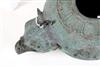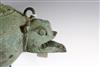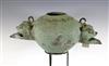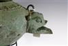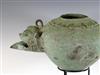 JAVANESE MAJAPAHIT BRONZE OIL LAMP OR CENSOR, Possibly 13th century. Patinated and aged Javanese bronze oil lamp featuring two mythical animals in the spouts. Age uncertain on this lot. Consignor acquired it while working in Indonesia and it was sold as an antique. - 13.5 in. Estimate $350-450