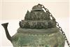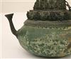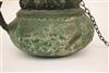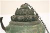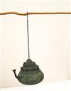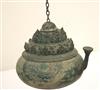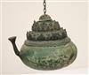 JAVANESE RARE MAJAPAHIT EMPIRE RITUAL WATER VESSEL, 12-13th century. Rare patinated copper alloy repousse hanging vessel for holy water depicting Mount Meru. These vessels are intended to hold amrita, the holy nectar issuing from the churning of the ocean of milk in Hindu creation myths. Such vessels were associated with the use of sanctified water in libations. Two other examples can be found in the Victoria and Albert Museum (IS.7-1994) and the Philadelphia Museum of Art (1990-85-1a,b). Present vessel was likely modified as the water spout is not original to the artifact. - height (bronze): 8 inches; bronze with chain: 22.5 inches. Estimate $600-850