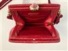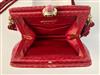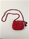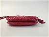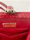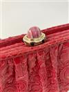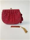 JUDITH LEIBER EMBROIDRED RED SNAKESKIN EVENIGN BAG, Made in Italy. All-over chain stitch embroidery exterior; red satin interior; gold hardware; pink marble cabochon closure set in gold-tone accented by "jewels" around circumference; red cord strap with tassels Estimate $200-300