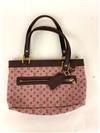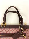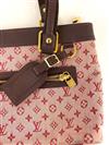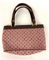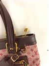 LOUIS VUITTON HANDBAG. pink monogram canvas and burgundy leather; goldtone hardware. Exerior zippered pocket; zippered closure; open interior pocket. 'LOUIS VUITTON - Made in France' label on interior - 7.5" x 12".Estimate $200-300