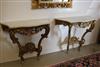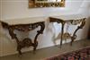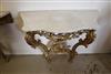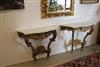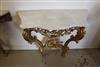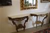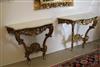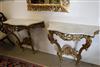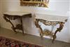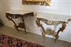 LOUIS XV GILTWOOD CONSOLE TABLE AND ANOTHER EN SUITE OF LATER DATE. Each with shaped, grey-veined white marble top above a waved, pierced frieze carved with C-scrolls and flowers; re-gilded. - H: 35 1/4". W: 38". D: 17 3/4". $2,500-3,500