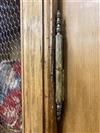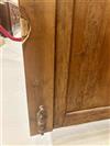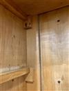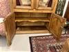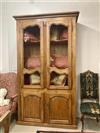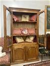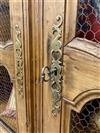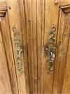 LOUIS XV PROVINCIAL FRUITWOOD CABINET WITH GRILLED DOORS. Flat molded pediment over pair grilled doors above pair paneled cabinet doors; three shaped interior shelves. H: 92 in.; W; 54 in.; at pediment, D; 21 in.Estimate $300-500