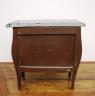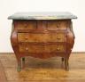 LOUIS XV STYLE BURLWOOD BOMBE THREE-DRAWER MINIATURE CHEST WITH MARBLE TOP Green marble top with serpentine front edge projects over two aligned drawers over two full-width drawers H: 16 1/2 in. W: 17 1/2 in.